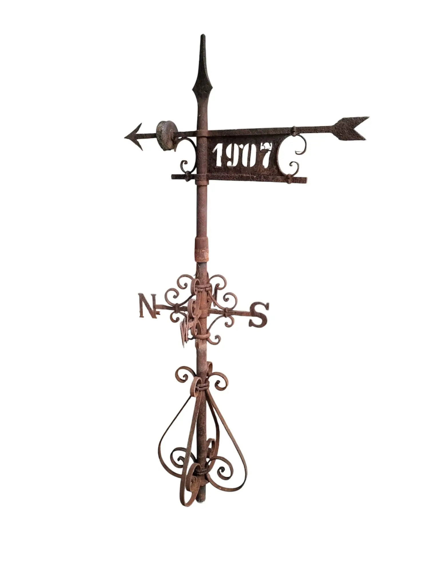 Originale Wetterfahne von einem Haus von 1907, Fund aus der Lüneburger Heide. Mit Jahreszahl und dekorativer Windrichtungsanzeige. Schöne Rostpatina mit authentischem Charme. Haltestange gekürzt. Ein seltenes Unikat – perfekt geeignet zur stilvollen Dekoration auf Scheunen, Gartenhäusern oder als außergewöhnliches Sammlerstück.